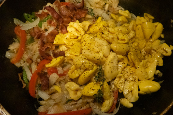 6. Once saltfish is heated gently fold in ackee, bacon pieces, season with black pepper, and allow to simmer for 5-10 minutes. Serve hot.