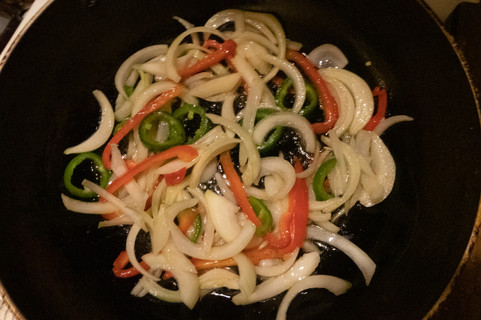 4. Heat cooking oil in a skillet over medium heat and add onion, bell peppers, jalapenos, and thyme. Cook until fragrant. Est. Time: 2-3 minutes.
